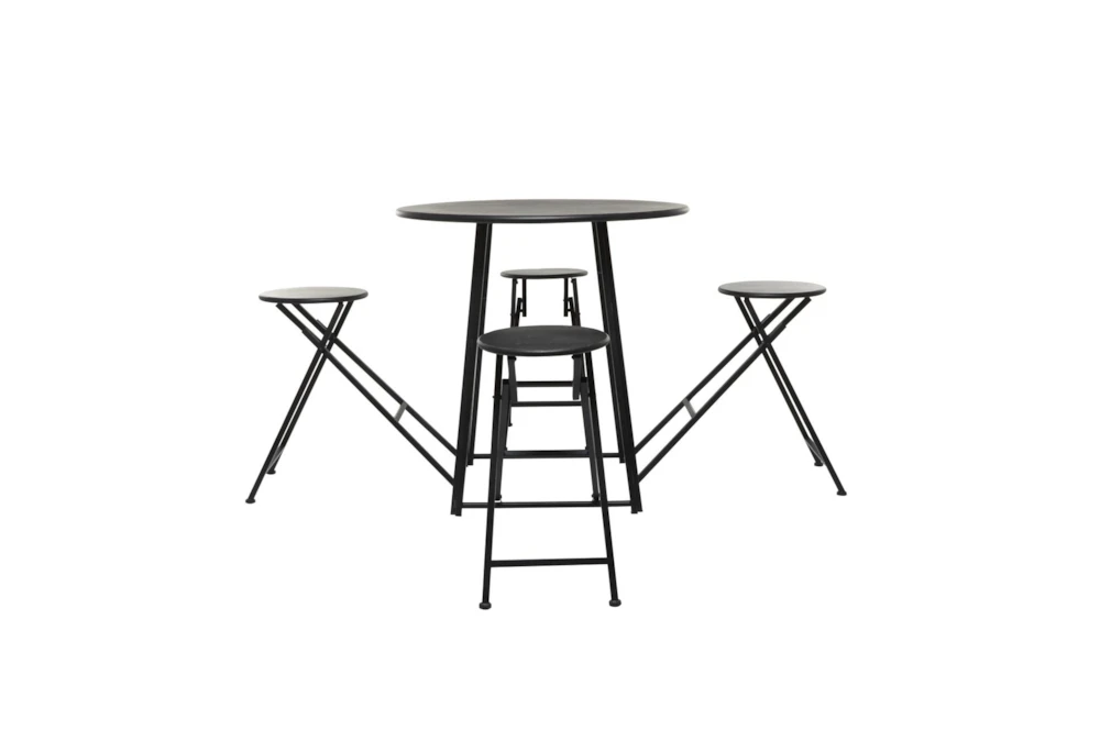 36 Inch Metal Counter Table With 4 Fold Out Stools is a tall industrial style dining room table crafted with a solid metal material in a grey color. The item features a round dining table with four chairs designed with a rustic theme influence for a cozy and organic feel.