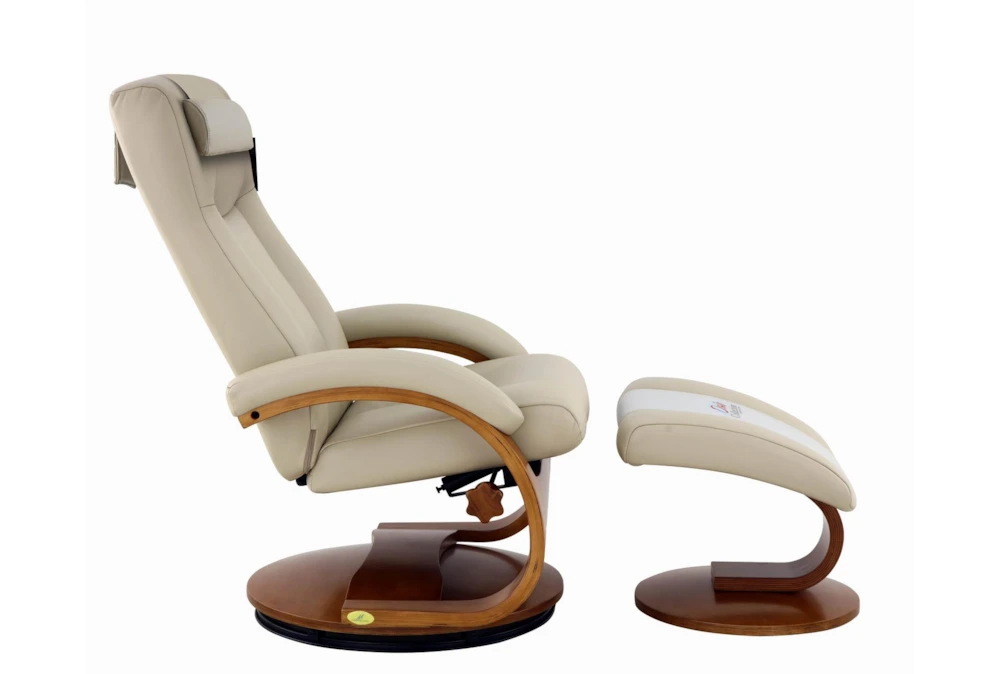 The Boden Beige Faux Leather Reclining Swivel Chair and Ottoman with Pillow is a modern-style chair ideal for your living room. It comes with an ottoman and is weather-resistant.