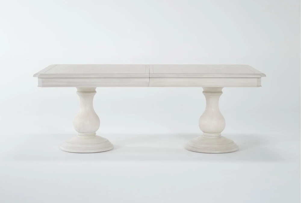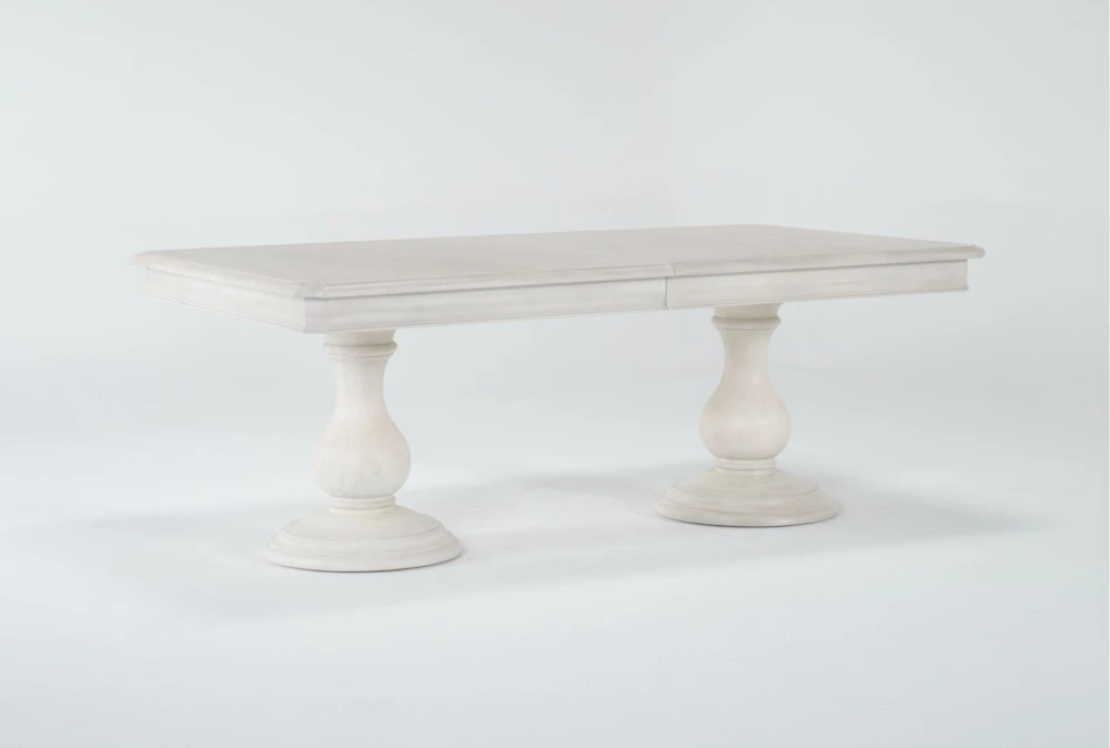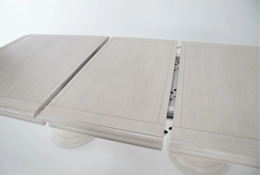 There is still a place for elegance in the dining room, as proven by our graceful and grand Caira II dining collection. Inspired by classic designs, the traditional details enrich each piece with character that will impress and delight all who gather here. Decked in a distinctive champagne finish, this table features functional and beautiful elements. Perfect for large gatherings, a leaf extension expands it to a generous 104 inches.