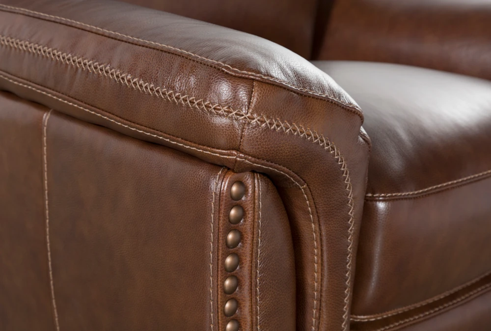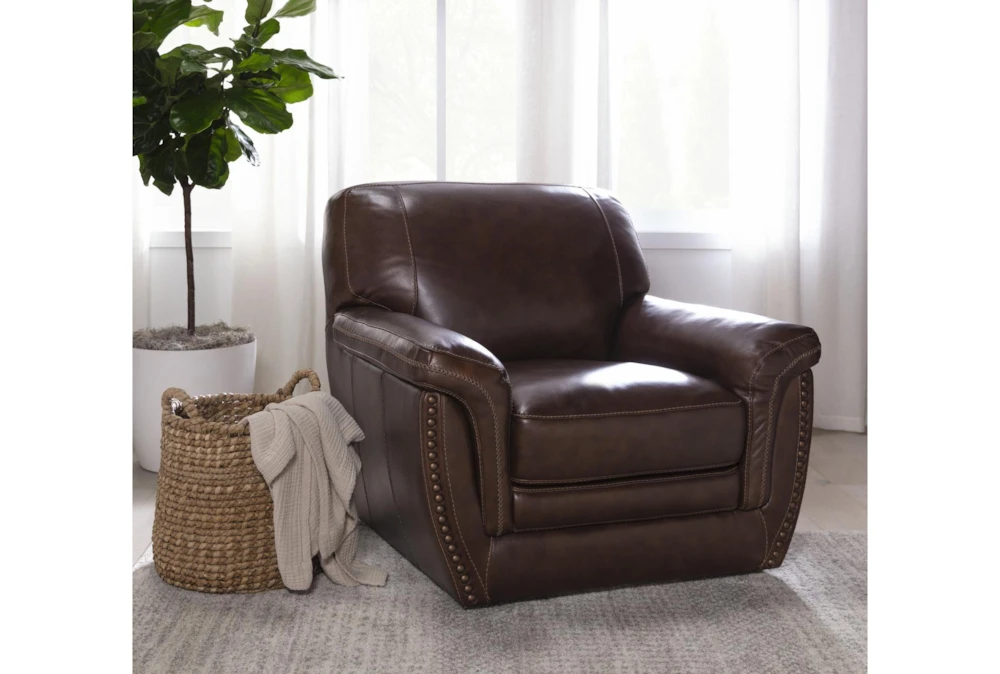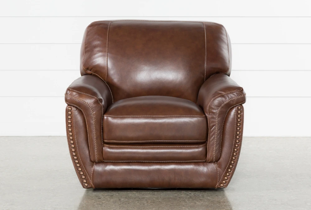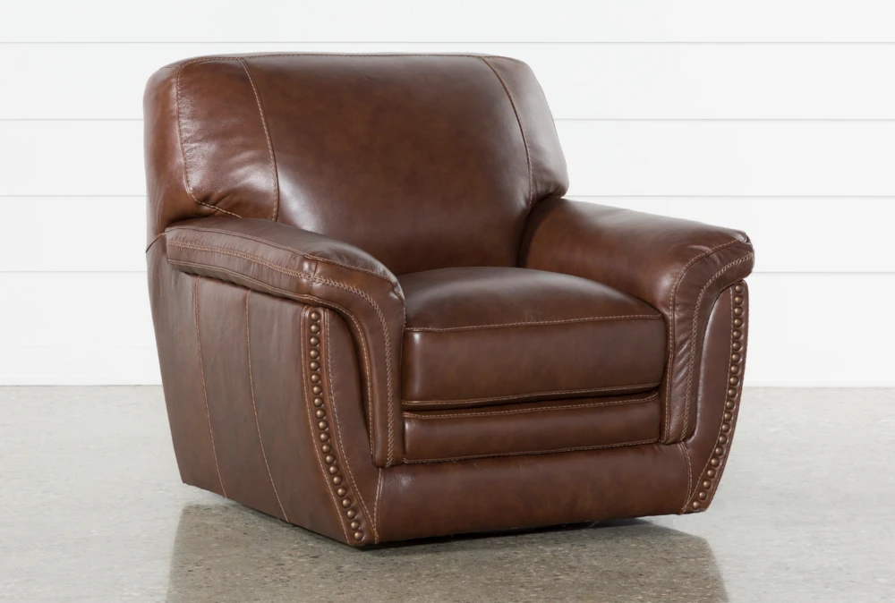 Bring luxury, quality and classic sophistication to your living room with our Cassidy swivel chair. Upholstered in naturally handsome 100% leather, this design is as irresistible on the inside as it is on the outside thanks to a seat cushion filled with a plush combination of supportive foam and soft down-blend. Its generous proportions are also balanced by tailored details and nailhead trim, plus it provides 360 degrees of complete comfort with its rotating base.