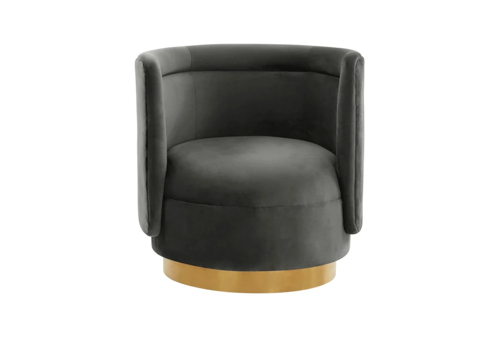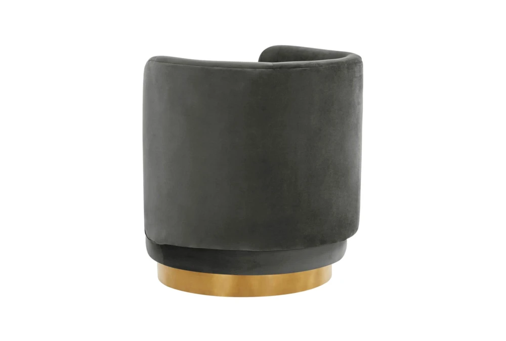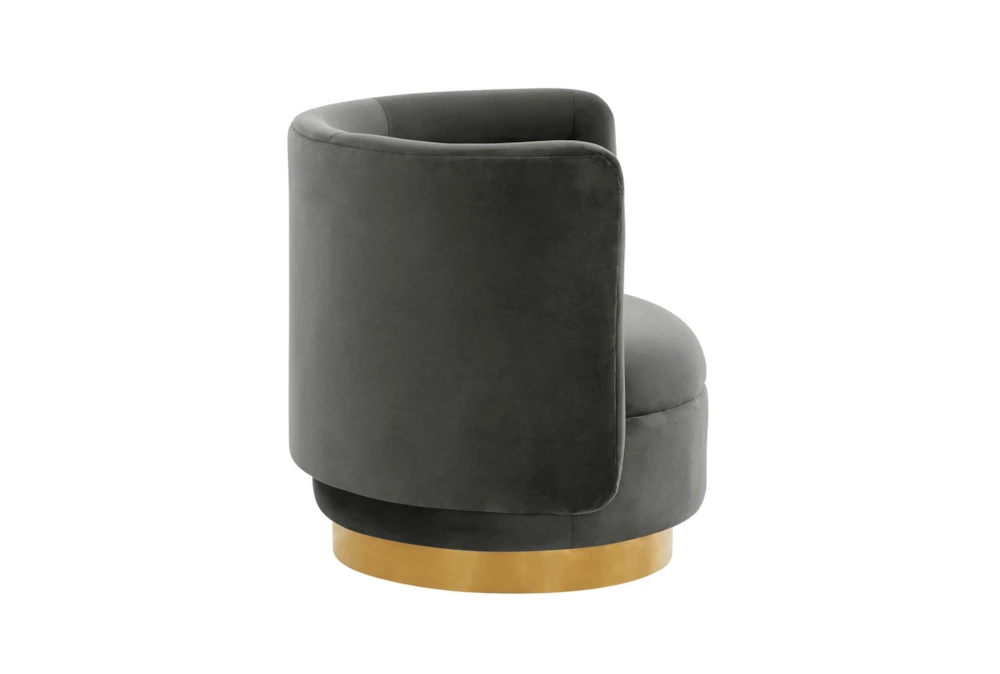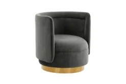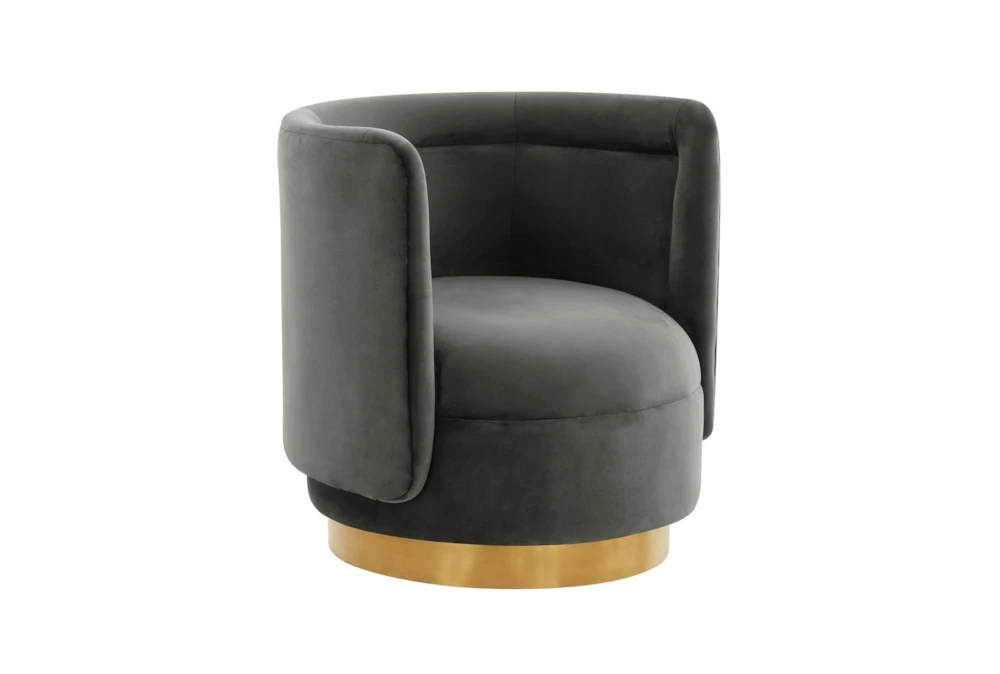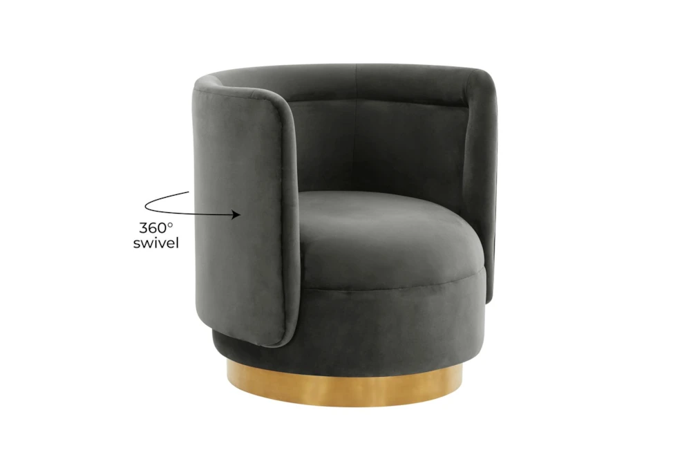 The Clarke Dark Grey Velvet Swivel Accent Chair is a modern indoor chair made of pine and velvet, featuring a curved design and foam cushions with a tight swivel back. Handmade by skilled furniture craftsmen, this chair comes in several colors, including dark grey, and boasts a 360 degree swivel and a kiln-dried pine frame with spring support.