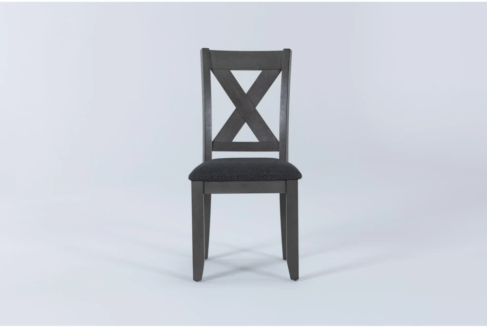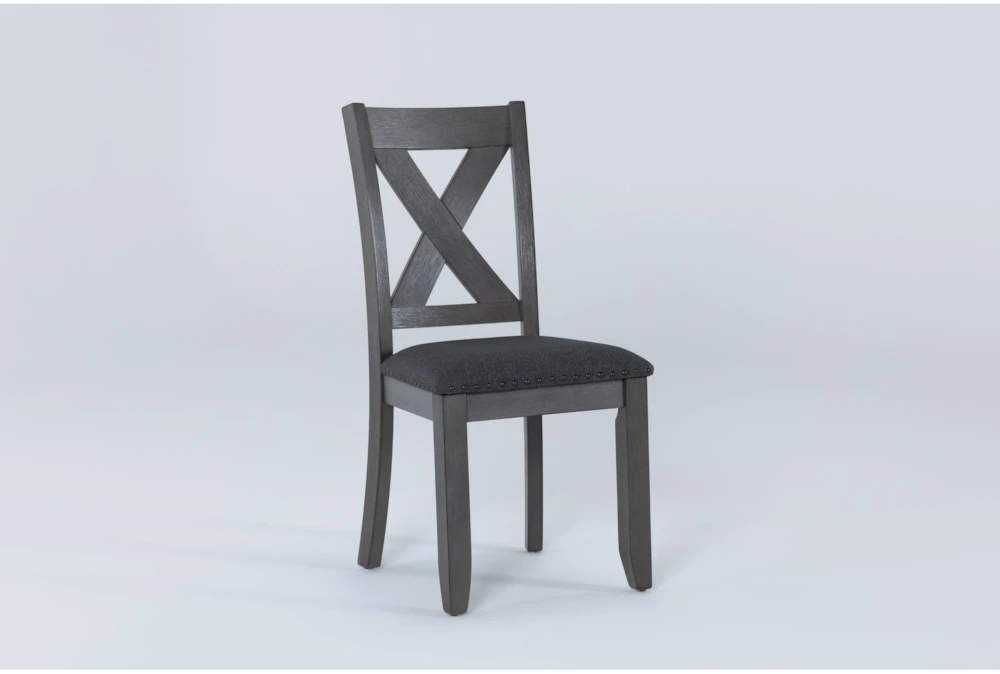The Eddie Side Chair is a casual dining room chair made of wood and fabric with a slat back, nailhead trim, and cushioned seat for comfort.
