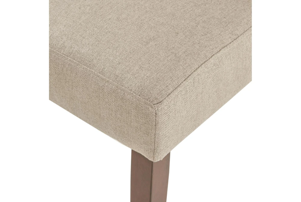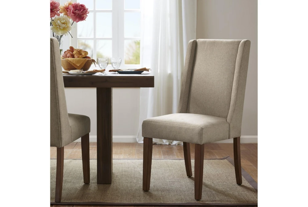 The Elijah Taupe Dining Side Chair Set of 2 is a casual style dining room chair set made of wood with a grey color. Assembly is required and they feature select hardwoods and plywood frame, birch legs, and a 100% polyester fabric. The wood finish is espresso and the filling is high density foam.