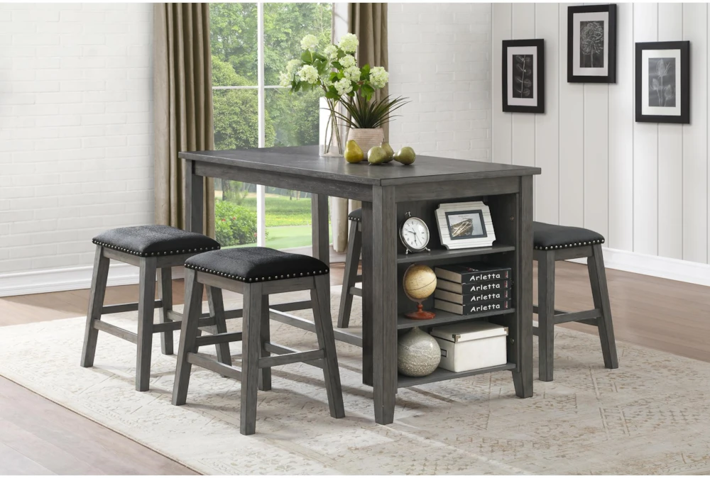 The Fideo Grey Counter Height Table is a rustic piece made of acacia veneer, wood, and engineered wood. It features storage, is tall and portable, and has shelves for added convenience. Assembly is required.