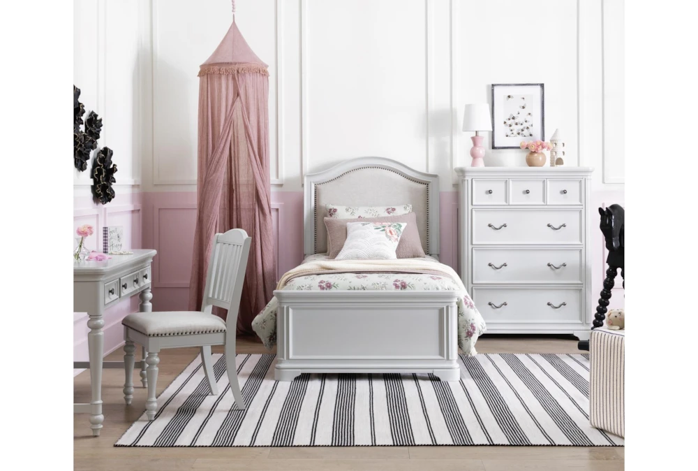 Our traditional yet youthful Julia desk chair will help transform your child’s bedroom into a space where they can blossom and evolve. Featuring elegant details and a soft grey finish, it’s just as suitable for young kids as it is for teens. Constructed to pair with the desk, it features graceful turned legs and a upholstered nailhead-trimmed seat.