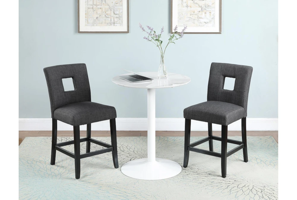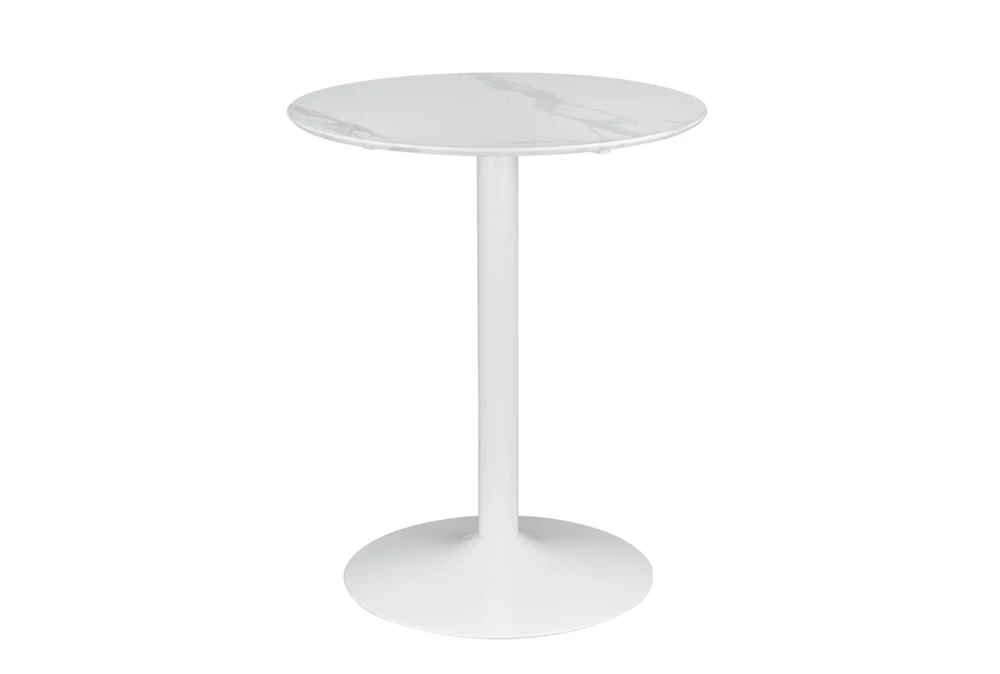The Maeve 30 Inch Round Counter Table is a modern piece made of metal with a tall, pedestal design. Its white color and beveled edge table top make it a stylish addition to any dining room.