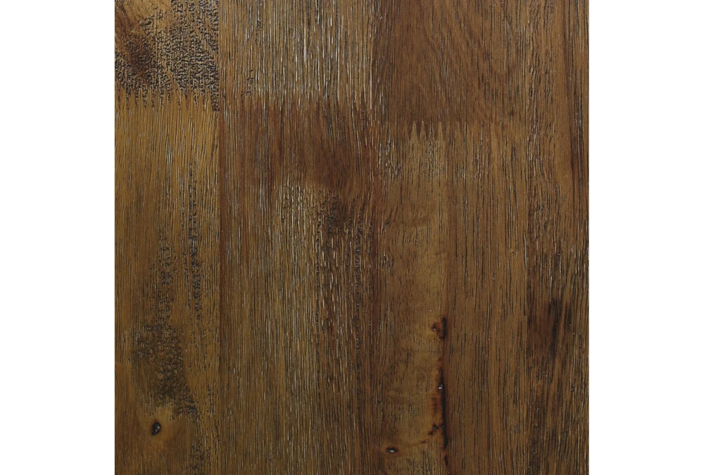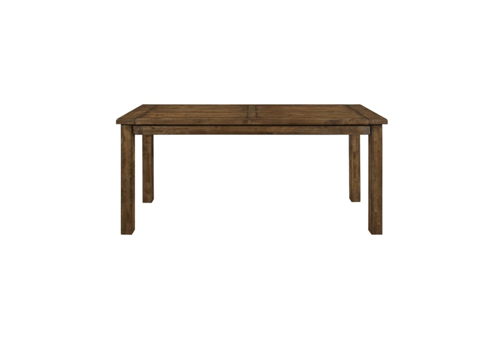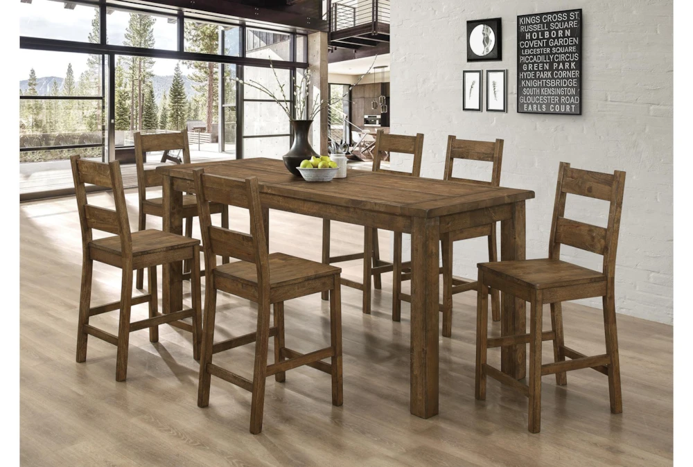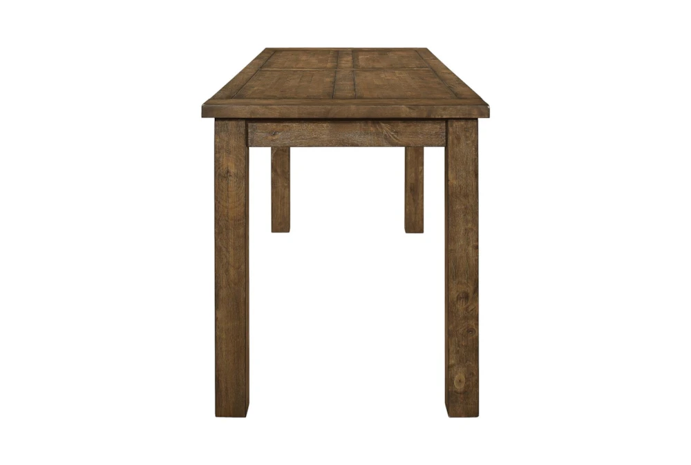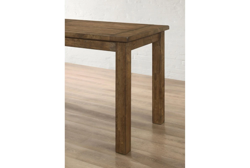 The Mcintyre Counter Table is a tall and long casual style dining table made of brown rustic golden brown wood and Asian hardwood, with a true square table top edge profile.