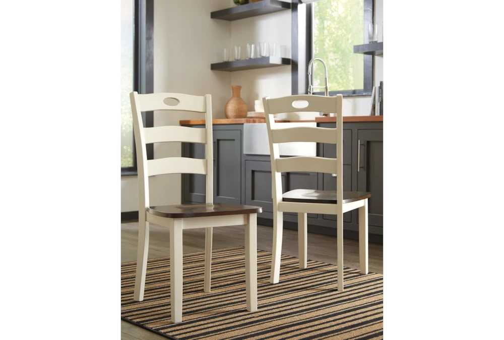 The Oakmont Side Chair Set of 2 features a slat back and armless design, perfect for a casual dining room setting. Assembly is required for these chairs made with veneers, wood, and engineered wood in a cream and brown color scheme.