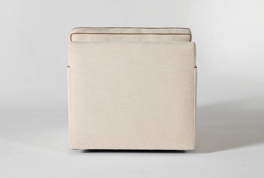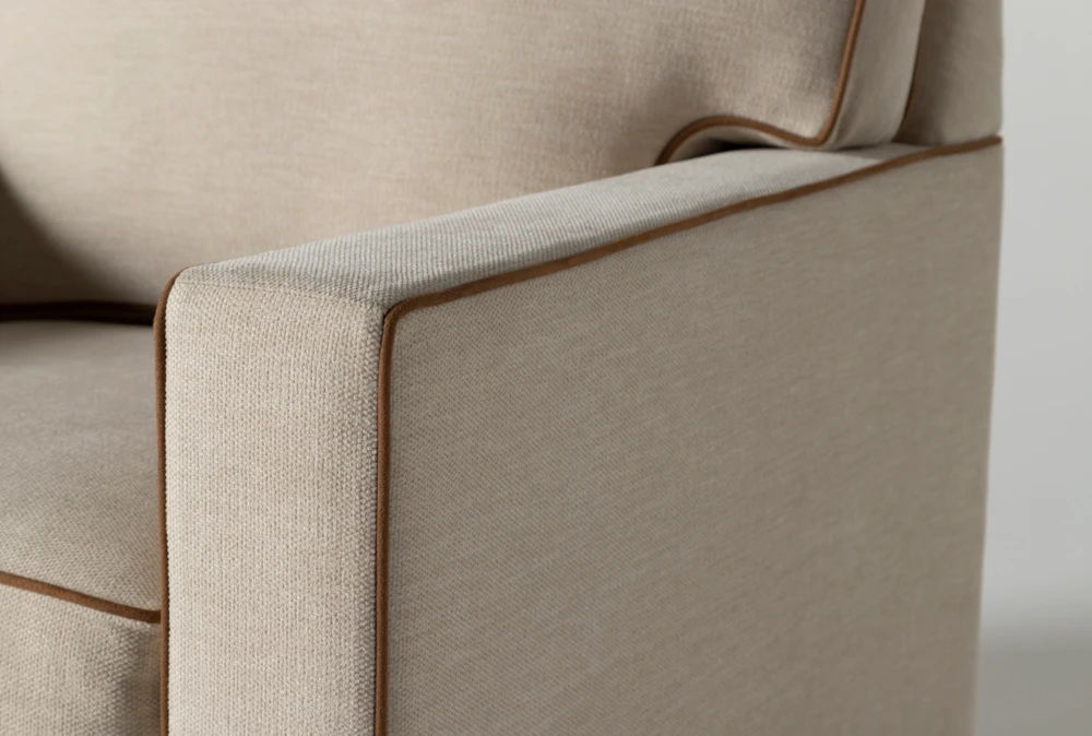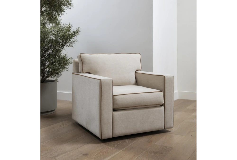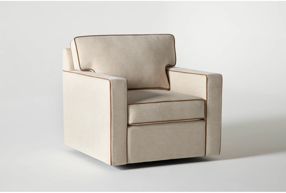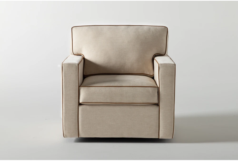 Add sophistication to your seating arrangement with Nate and Jeremiah’s Reeves swivel accent chair. Distinguished by tailored contrast piping, the design boasts clean lines and classic details. Not only does it embody a perfect balance of masculine and feminine, it brings refined comfort to any space. In addition to the benefits of cleanable, durable performance fabric, this piece allows you to enjoy a full-circle experience with its swivel base. The upholstery is customizable through our Special Order program, but the contrast piping is not.