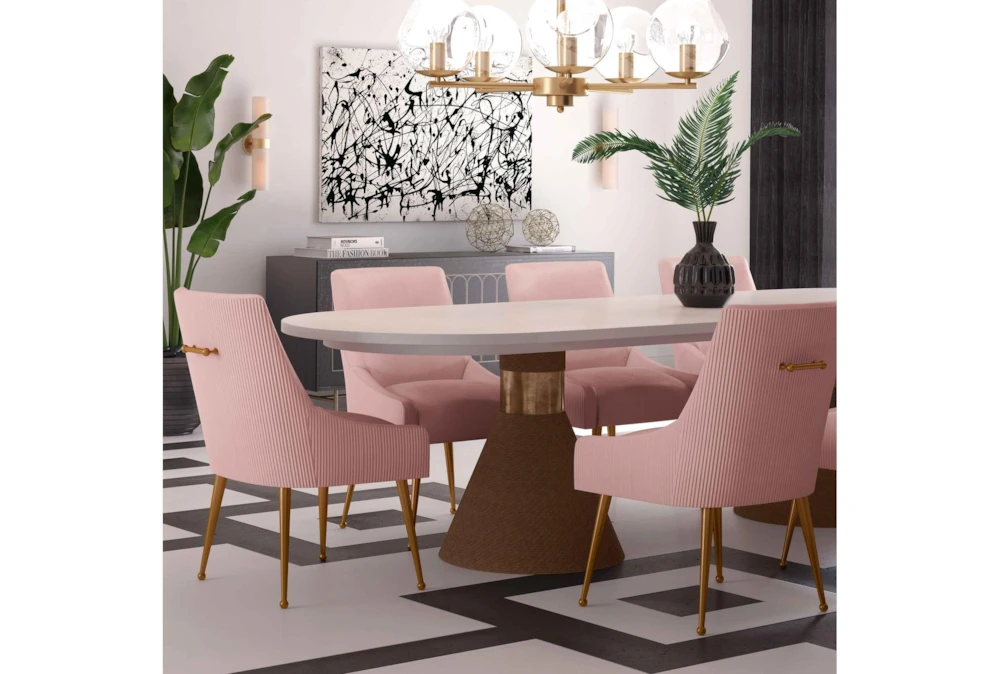 The Rosalind Pleated Back Blush Velvet Dining Chair is a durable yet sumptuous chair that features a tight back, cushion, and is without wheels. Its traditional style and pink color make it the perfect addition to any dining room.