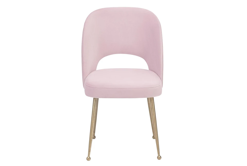 The Shirley Blush Velvet Dining Chair is a modern piece of furniture crafted from sumptuous velvet upholstery and stainless steel gold legs. This handmade dining chair is perfect for any dining room looking for a touch of elegance and sophistication, available in the colors pink, blush, and velvet.