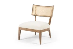 This Solid Beech + Cane Back Accent Chair is the perfect addition to any modern bedroom with its armless design and comfortable back support. Made with high-quality polyester material and accented with wood and wicker, this beige chair is both stylish and functional.