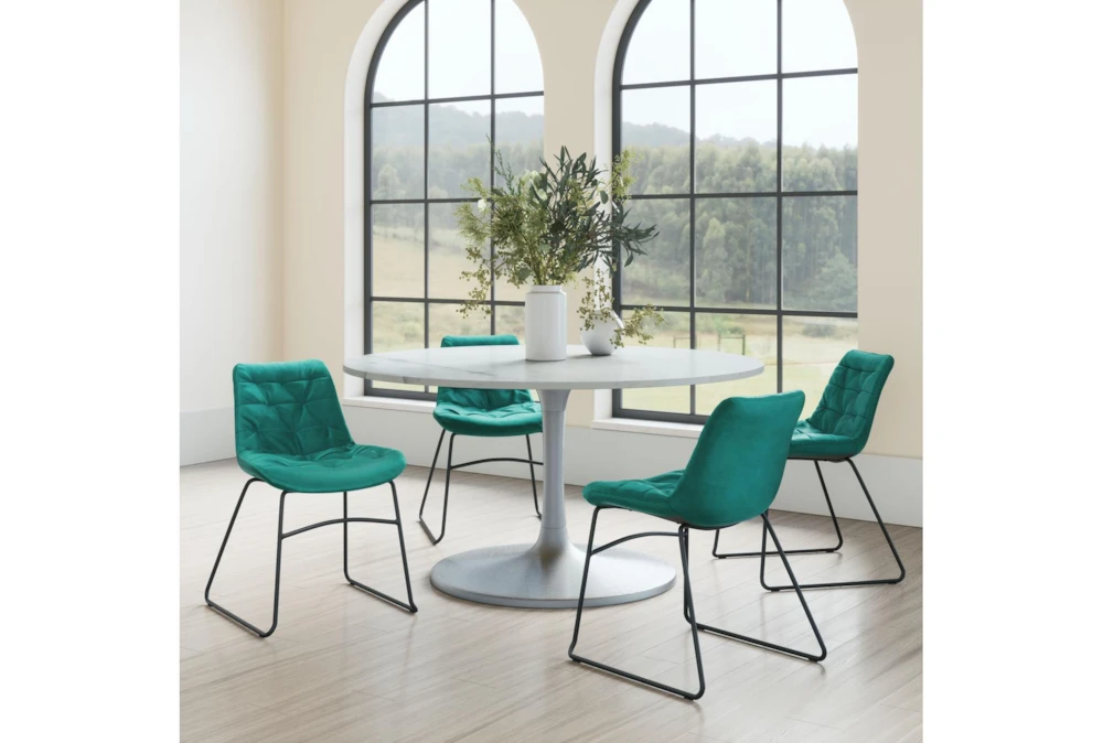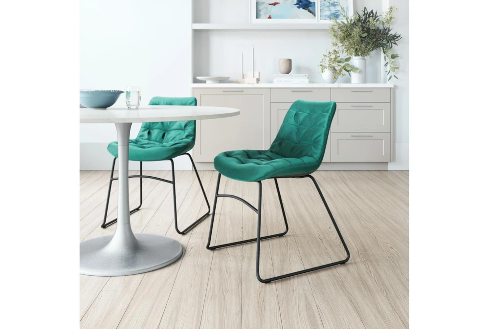 The Tandy Dining Chair in Green is a modern piece made of plywood and velvet, with a tufted upholstery seat that provides soft and smooth fabric. Assembly is required.