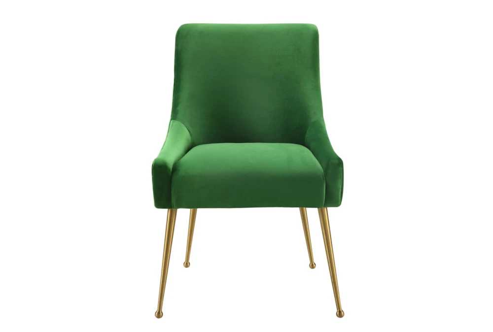 The Trix Green Velvet Dining Chair is a modern armless chair made with durable fabric and metal, perfect for any dining room. Its elegant curve design and sumptuous velvet upholstery are complemented by fab gold stainless steel legs.