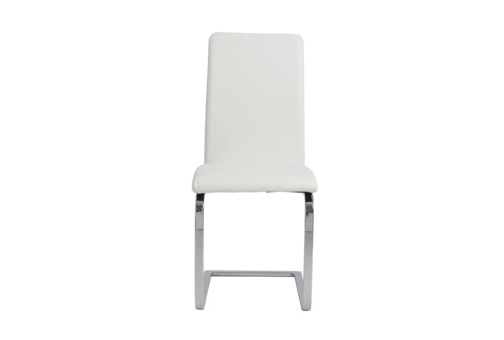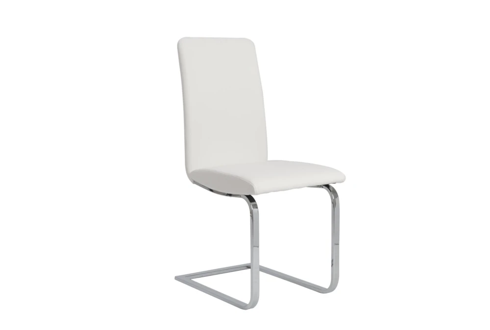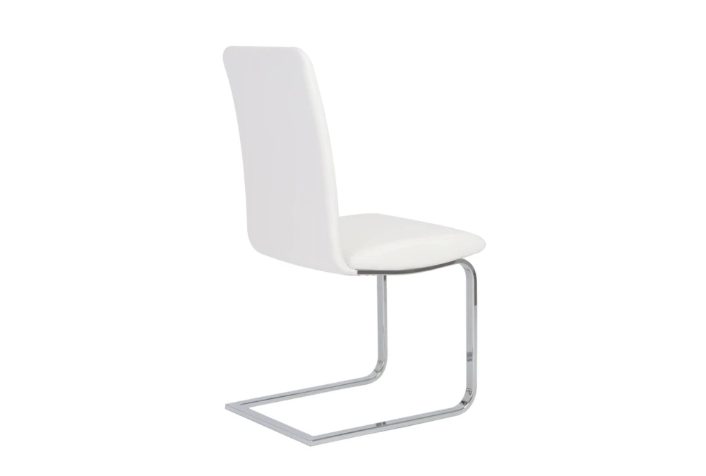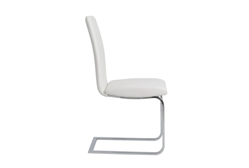The White Faux Leather And Stainless Steel Cantilever Side Chair set features a modern style and includes two chairs.