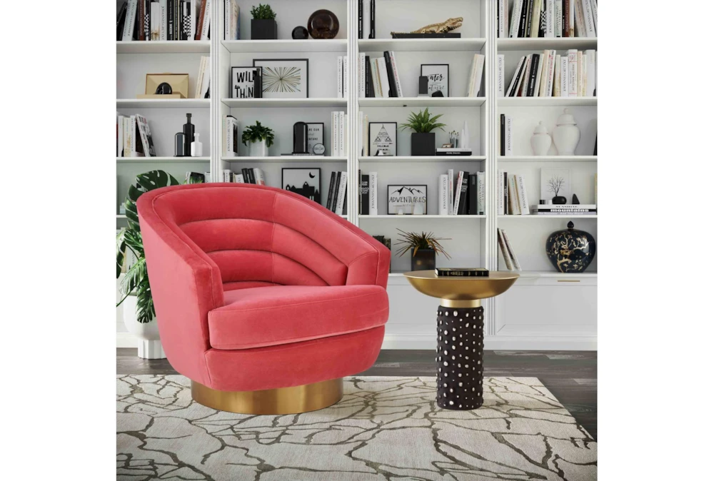 The York Hot Pink Velvet Swivel Accent Chair is a contemporary-style indoor chair with a handmade elegantly curved design, 360-degree swivel, and channel tufted pink velvet cushion. The chair is made of fabric and metal, comes fully assembled, and is perfect for use in living rooms or bedrooms.